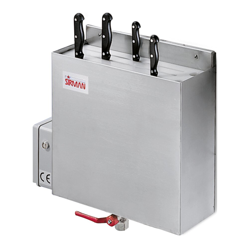 Електричний стерилізатор для ножів EL виготовлений з нержавіючої сталі , кришка виготовлена з поліпропілену. Стерилізація виконується гарячою водою, автоматичний контроль температури до 90 °C. Стерилізатор для ножів EL оснащений 2 регулюючими кранами для подачі та зливу води.