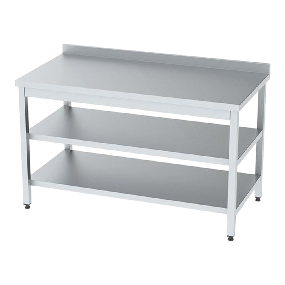 Професійний стіл типу С з бортиком і двома полицями призначений для організації робочого простору та зберігання інвентарю на професійних кухнях. Конструкція з нержавіючої сталі забезпечує довговічність і гігієнічність.