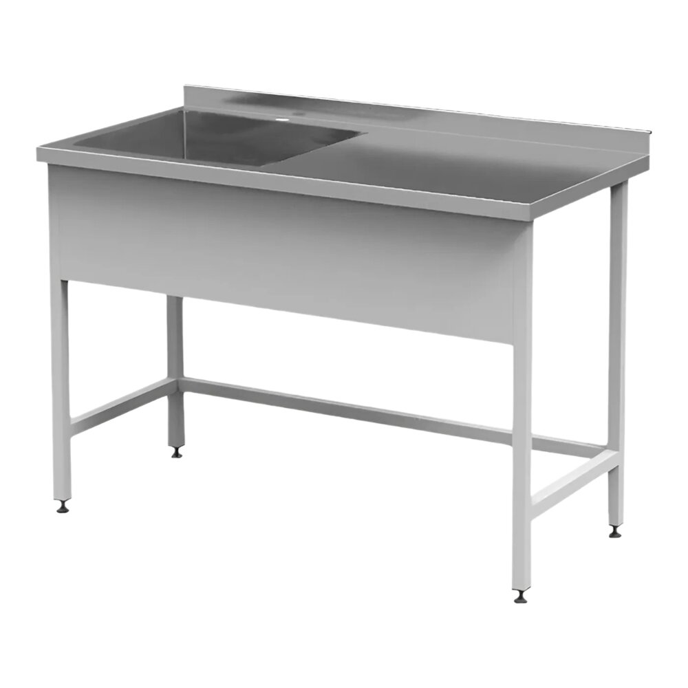 Професійний стіл з мийкою, розташованою з лівого боку, призначений для використання на підприємствах громадського харчування, у закладах HoReCa та харчоблоках. Виготовлений з нержавіючої сталі, стійкої до корозії, вологи та мийних засобів. Оснащений нижньою полицею для зберігання інвентарю та посуду.