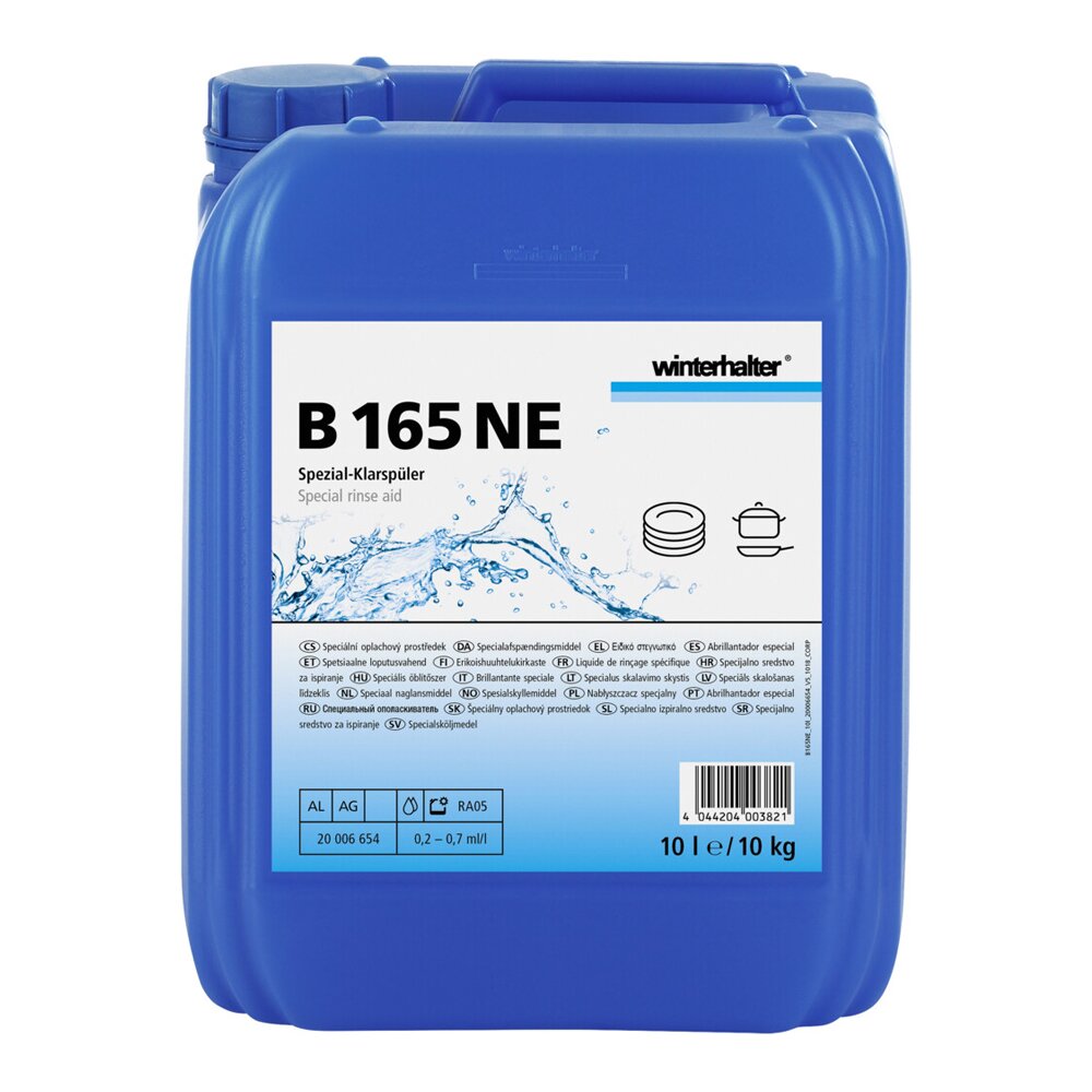 Ополіскувач Winterhalter B 165 NE. Ополіскуючий засіб з ефектом активного придушення піни. Ідеальне поєднання ретельно підібраних інгредієнтів усуває неприємні запахи і перешкоджає утворенню піни. Ви можете бути впевнені в тому, що результати миття будуть ідеальними за будь-яких умов.